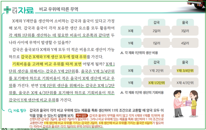 예시: 위에서 갑국은 쌀 1단위 생산 시 물고기 2단위를 포기해야 합니다 (쌀 20시간 → 물고기 2단위 생산 가능). 반면, 을국은 쌀 1단위 생산 시 물고기 4단위를 포기해야 합니다 (쌀 60시간 → 물고기 4단위 생산 가능). 이 경우 쌀 생산의 기회비용은 갑국이 더 낮으므로, 갑국은 쌀에 대해 비교 우위를 가집니다.