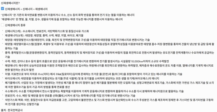 * 재생에너지(8개) : 태양광, 태양열, 풍력, 수력, 해양, 지열, 바이오, 폐기물