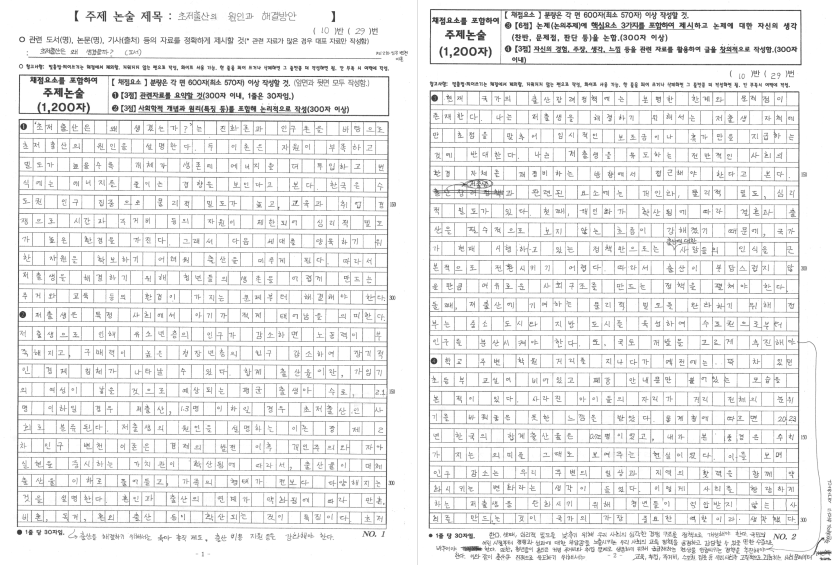 * **논술지는 1장만:** 학생들은 경쟁을 자극할 수 있어, 1장을 초과하는 경우 채점에서 제외한다고 사전에 공지합니다. 원고지 칸에 초과되는 내용은 채점에 포함되지는 않지만 감점되지 않는다고 공지하여 초과작성하는 학생의 불만을 없애고, 채점에서도 과잉 점수를 주지 않으므로 평가 부담을 줄일 수 있습니다.(원고지 칸에서 초과되는 부분은 채점에서 제외하지만, 감점은 하지 않는다고 평가시간에 공지하면 평가에 큰 부담이 없음.)